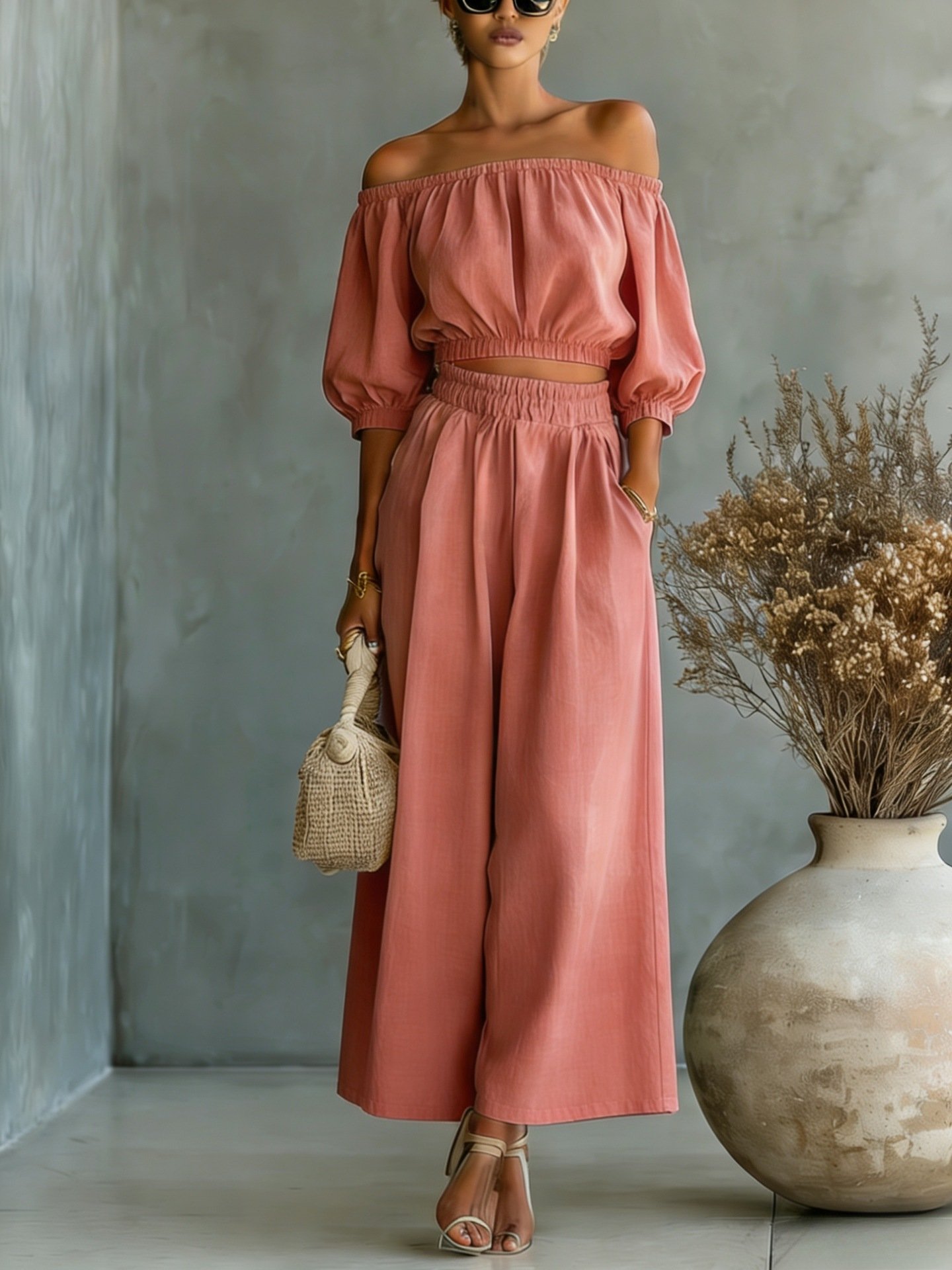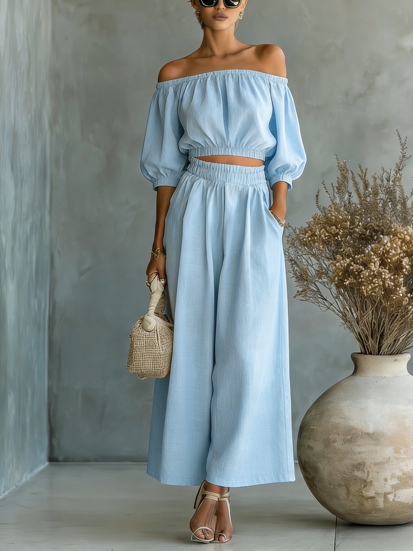 Casual Solid-color Cotton And Linen Top With High-waisted Wide-leg Pants