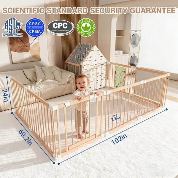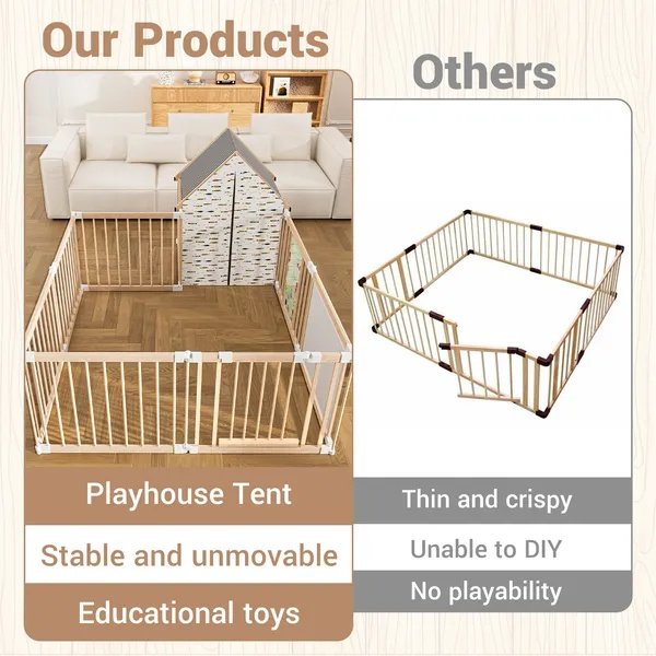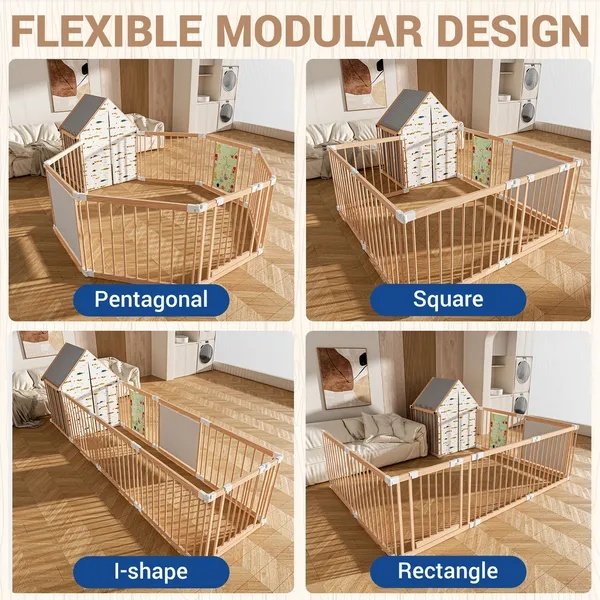 Natural Wood Baby Playpen 10 Panel Foldable Play Yard with Door Panel and Built-in Toys Easy to Assemble Foldable Assembled Into Various Shapes includes Two Play Panels and Playhouse