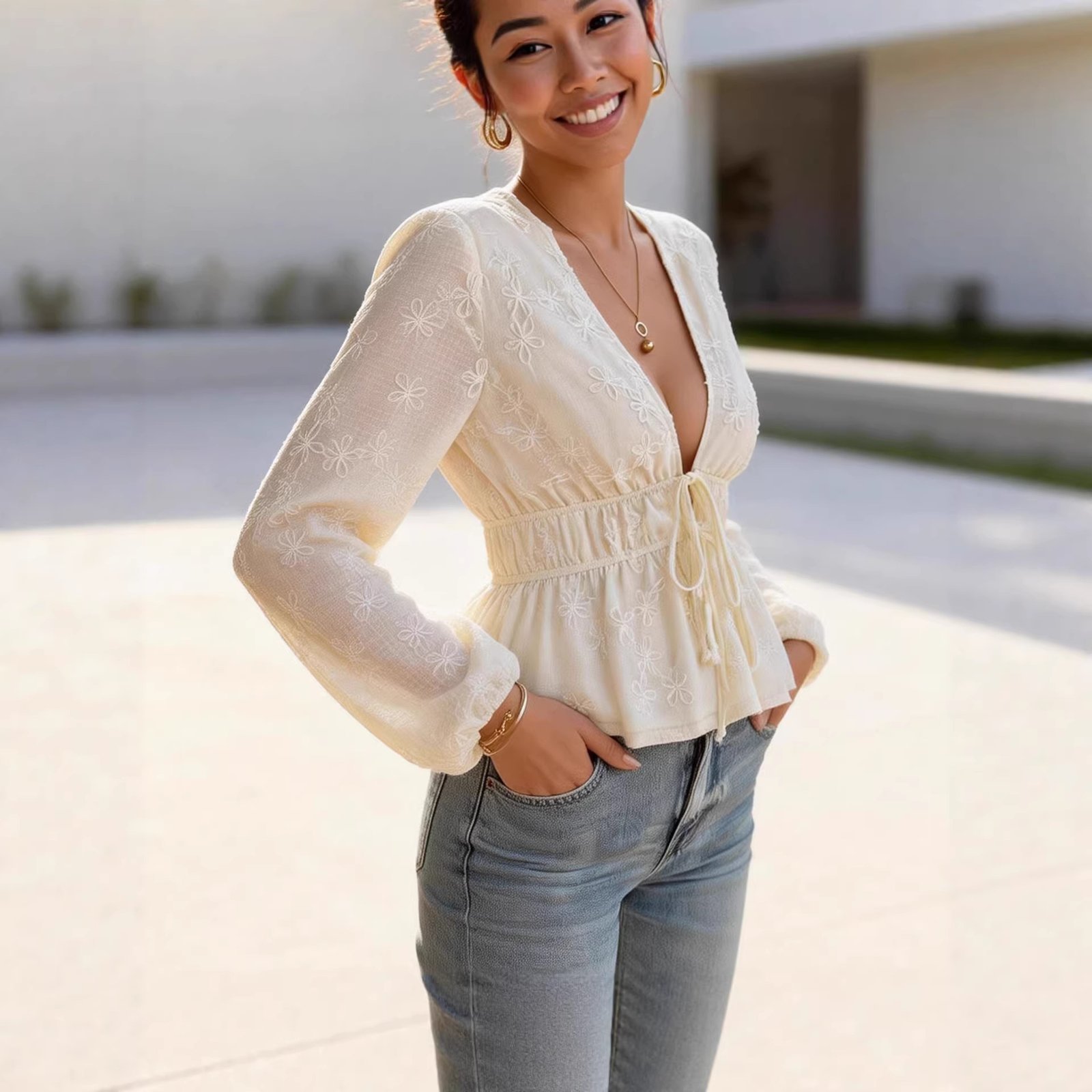 Solid-color Lace-up Waist-defined V-neck Elegant Figure-flattering Puffed-sleeve Top